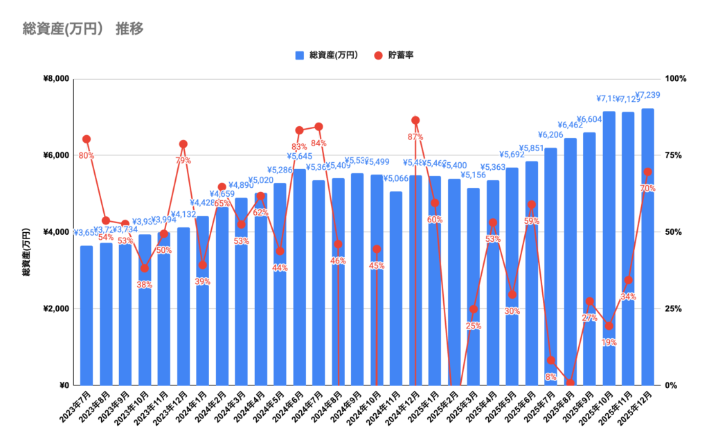 さて、2025年1発目の記事として、2025年末に6,000万円を目指すと宣言した(以下記事)ところ、6,000万円は25年7月に到達。そのままの勢いで、25年末時点で7,239万円(24年末比+1,759万円)の着地となりました。