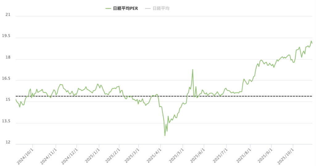 例えば、日経平均のPERは、これまで大体15〜16.5の間で推移することが多かったところ、直近では19近くまで上昇しています。