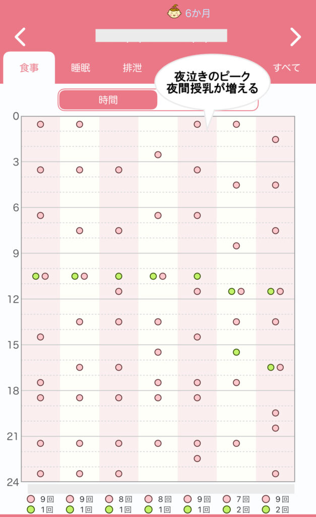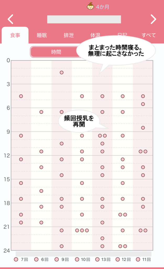 | 3-4時間おき | 5-7回 (うち夜間1-2回) | 離乳食が1日2回に。 添い乳により乳腺炎になりかける。 |