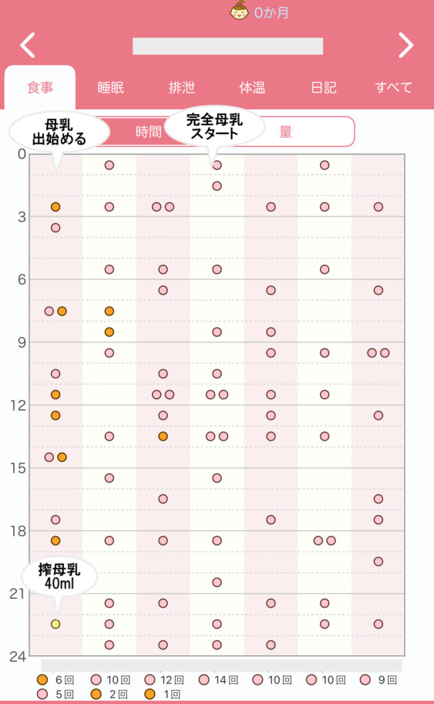 | 5日 | 3時間おき | ミルク6回 直母5回 | 胸が張ってくる。 初めて母乳40ml搾乳。 ミルクを減らし始める |
