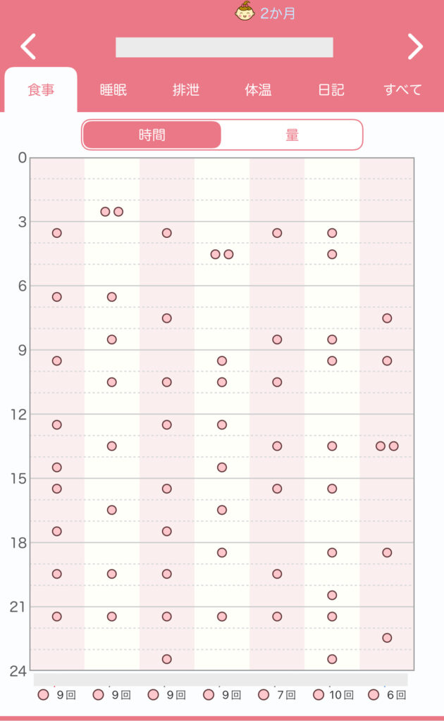 | 2-4時間おき | 9-12回 (うち夜間2-3回) | 母乳が過剰製造、 胸が異常に張る。 乳腺炎になりかける。 |