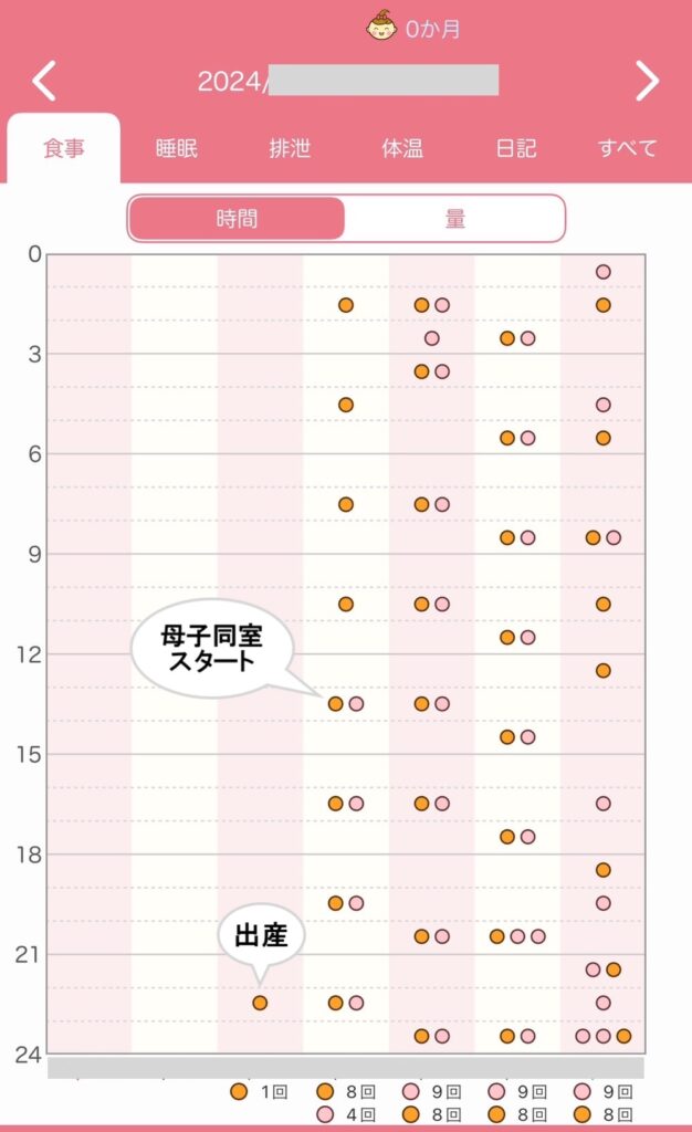 | 1-4日 | 3時間おき | ミルク8回直母9回 | 母子同室スタート 母乳3g |