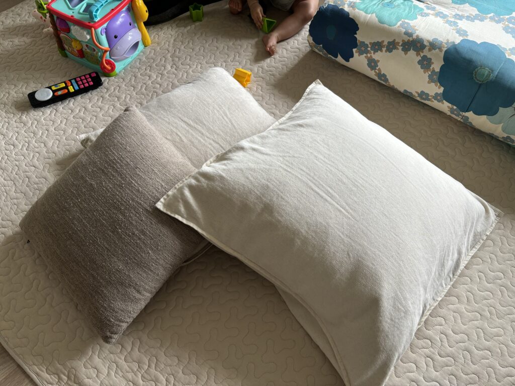 最初は自宅にあるクッションを複数使って授乳していたのですが、授乳中に赤ちゃんの重さでクッションの高さが下がってしまうのが難点でした。