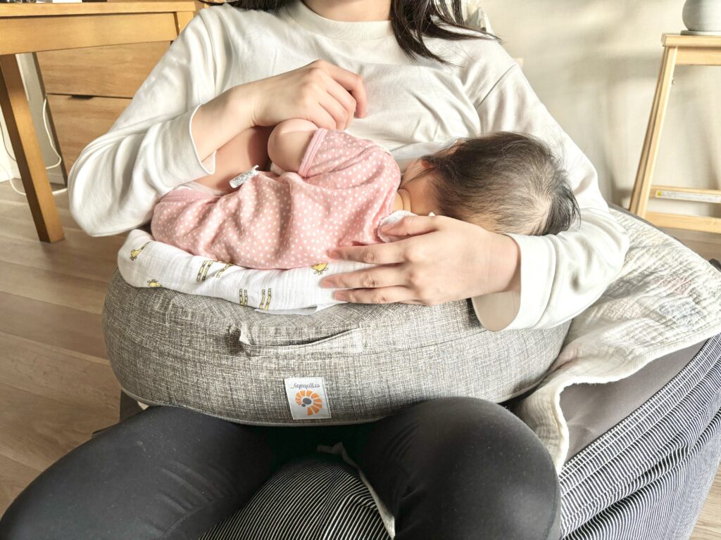 自宅のクッションだけでは限界を感じ、硬めのクッションとして口コミの良かったエルゴベビーの授乳クッション「ナチュラルカーブ・ナーシングピロー」を産後間も無く購入しました。