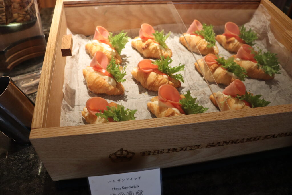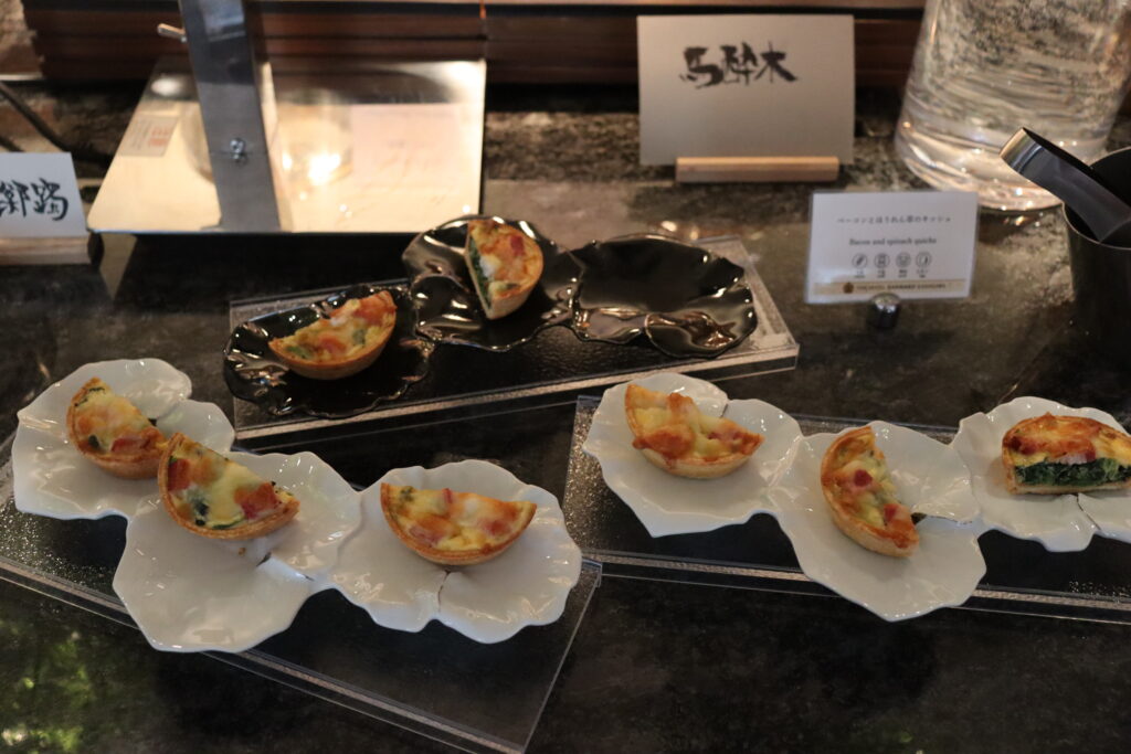 甘くない軽食として、主にハムサンドイッチとキッシュが用意されていました。