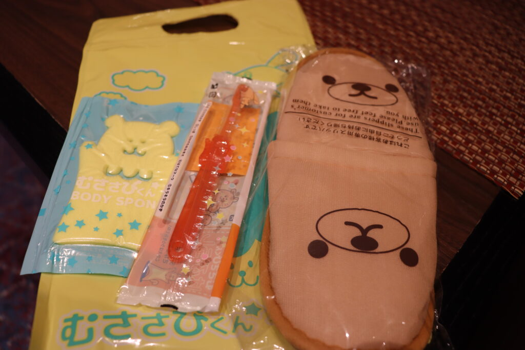 スリッパ、歯ブラシ、体用のスポンジが入っていました。