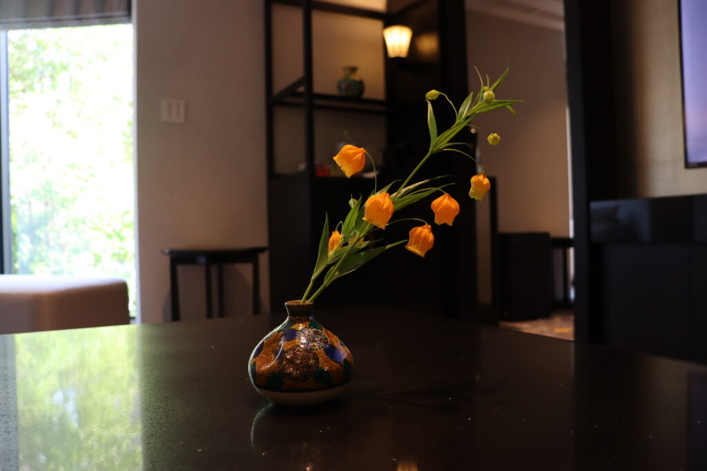 ローテーブルに置いてある花瓶を倒さないように注意しましょう。