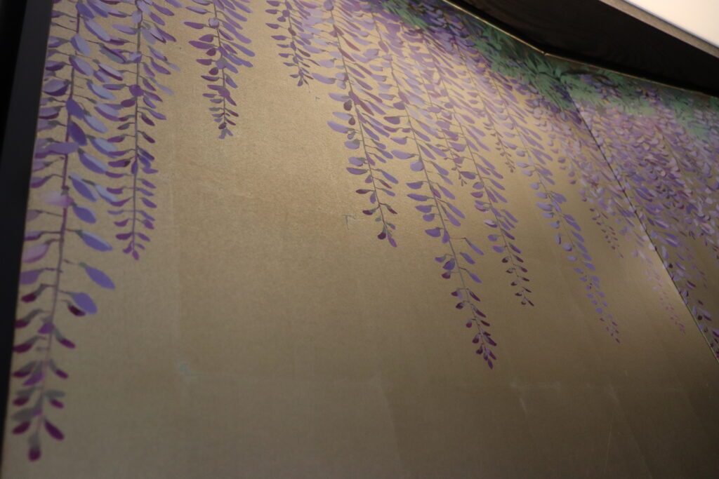 ベッドの頭上の壁面はゴールドの屏風で、藤の花が描かれていました。